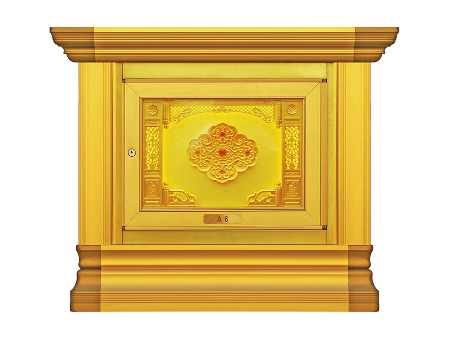 骨灰存放架是由箱體、面板、側板、頂蓋、底座、轉角、封板等構成,以及佛臺、掛落、佛 龕等相關配件構成。 箱體:分鍍鋅板、不銹鋼板、鋁板等五金板材箱體,鋁合金中空板扣接式箱體和純鋁壓鑄型 箱體。 面板:面板根據工藝不同、材料不同,風格各異、大不相同,既要起到美觀易分類作用,又 要起到防火、防塵、防潮、防蟲等作用。 側板:用于裝飾和保護箱體側面的作用,又可根據現場,對存放架分類的標識作用,一目了 然方便管理。 頂蓋、底座:都是穩固整列和整排箱體水平線,底座還起到一部分承重作用。 轉角、封板:箱體轉彎處和空隙處塑形的作用。 佛臺:由幾個骨灰存放架組成一個小型佛龕臺,用于放置佛像。 佛龕、掛落:整排存放架為了劃分區域,在每個區域靠墻上方,設置小型佛龕,為了美觀, 加上掛落。